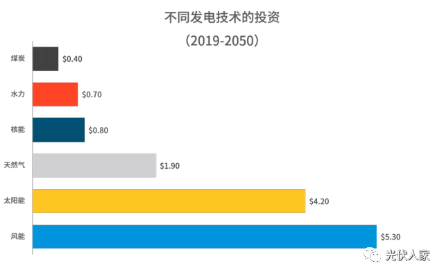 风能与太阳能的投资将分别达到5.3万亿美元和4.2万亿美元